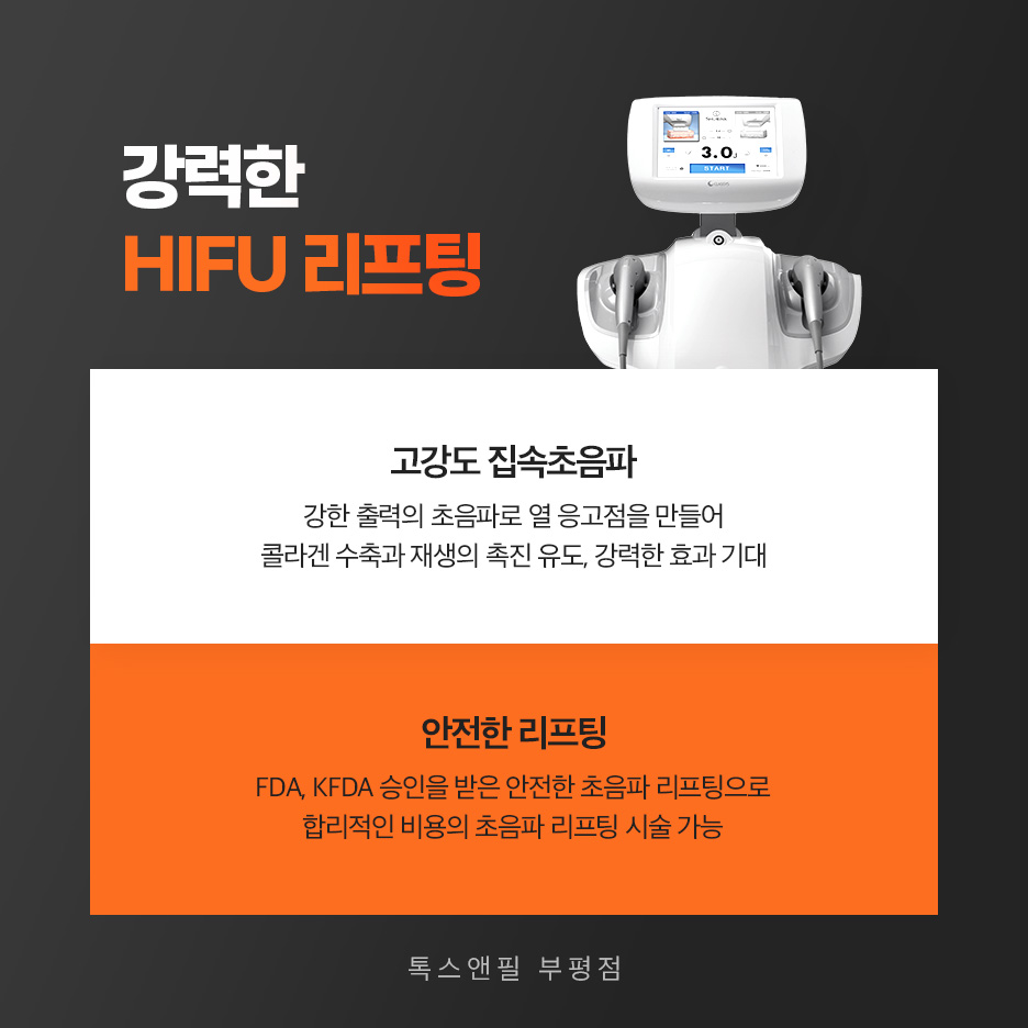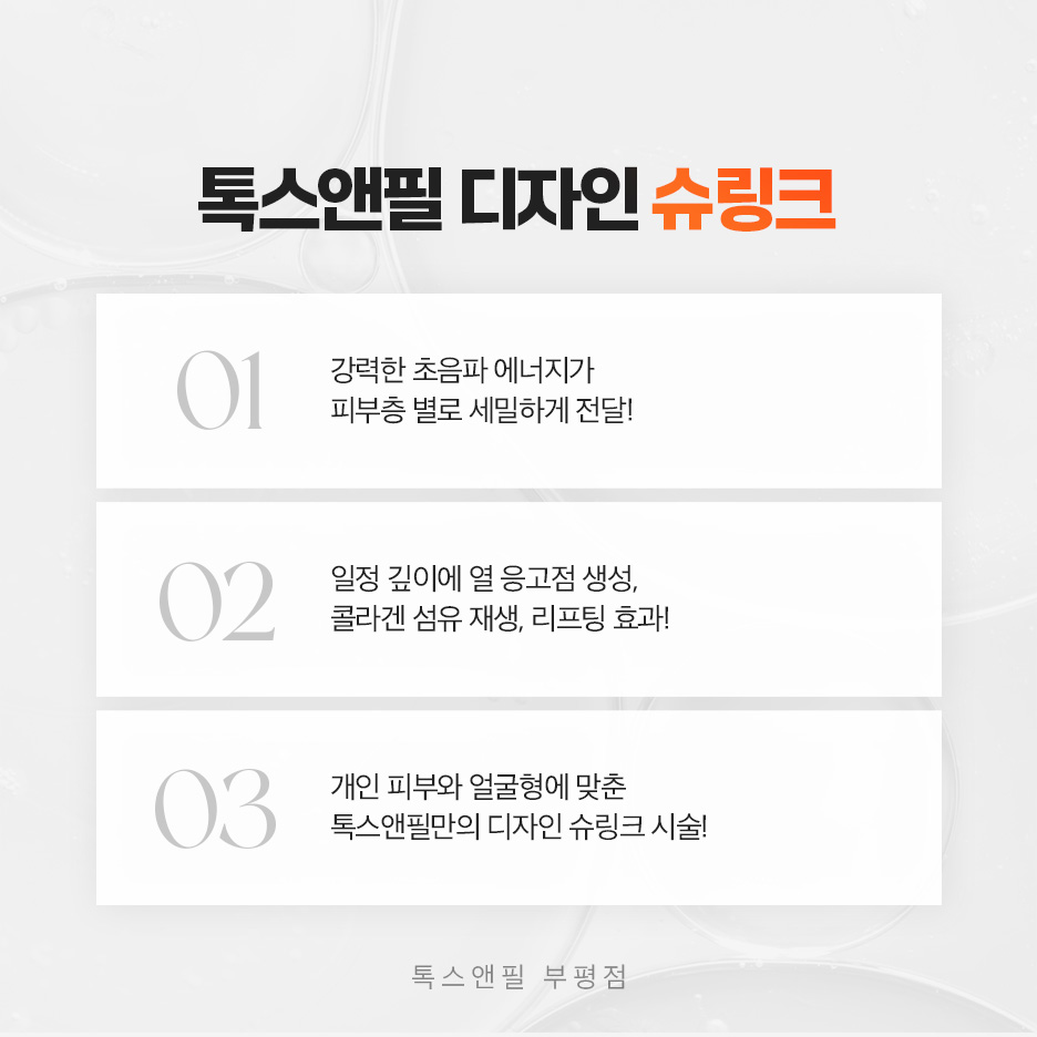 해당 프로그램을 통해 초음파 에너지를 기존 레이저가 도달하지 못하던 피부 속 깊은 곳까지 전달하고 나면 주름 개선 및 윤곽선 정돈의 효과까지 기대할 수 있습니다.