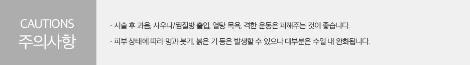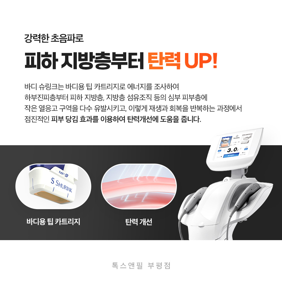 다행히 BODY SHURINK의 경우 시술이 비교적 간편한 방식으로 이루어지며, 보조적인 약품 등을 투입하지 않아도 스스로 자체적인 탄력을 자연스럽게 높여줄 수 있는 방법입니다.