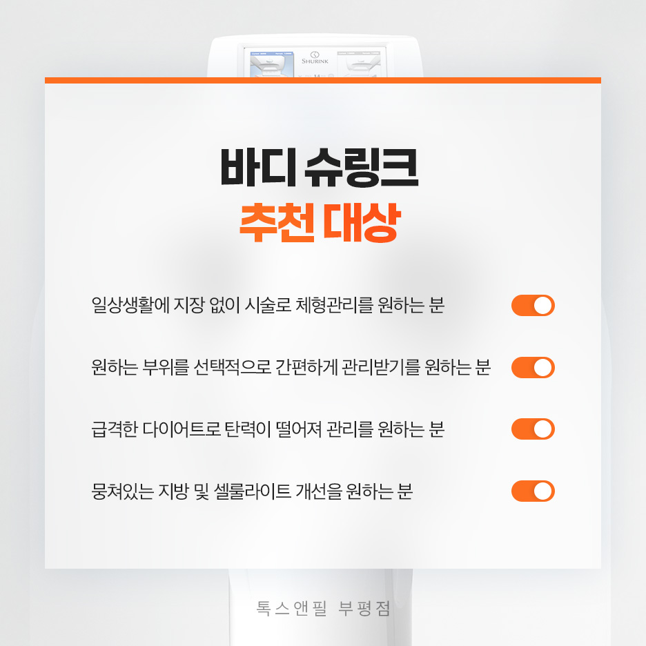 얼굴을 넘어 BODY에 대한 관리 역시 적극적으로 이루어지고 있는 요즘, 많은 분께서 부평피부과 톡스앤필 부평을 찾고 계십니다. 이와 같은 상황에서 적용해 볼 수 있는 대표적인 프로그램으로는 '바디 슈링크'가 있는데요. 여러분은 혹시 해당 프로그램의 특징과 원리에 대해 잘 알고 계시는 편이셨나요?
