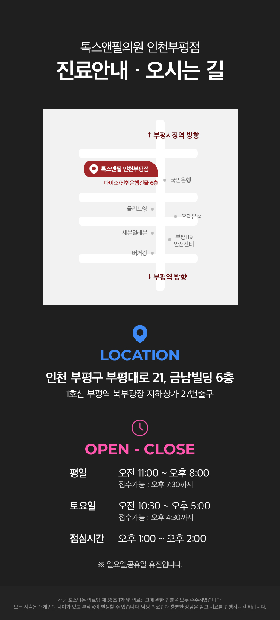 이를 위해 어떤 곳을 찾아야 할지 고민하고 계셨다면 부평피부과 톡스앤필 부평을 떠올려 보시는 게 어떨까요? 늘 세심한 자세로 다가가는 본원이 될 것을 약속드립니다. 감사합니다.