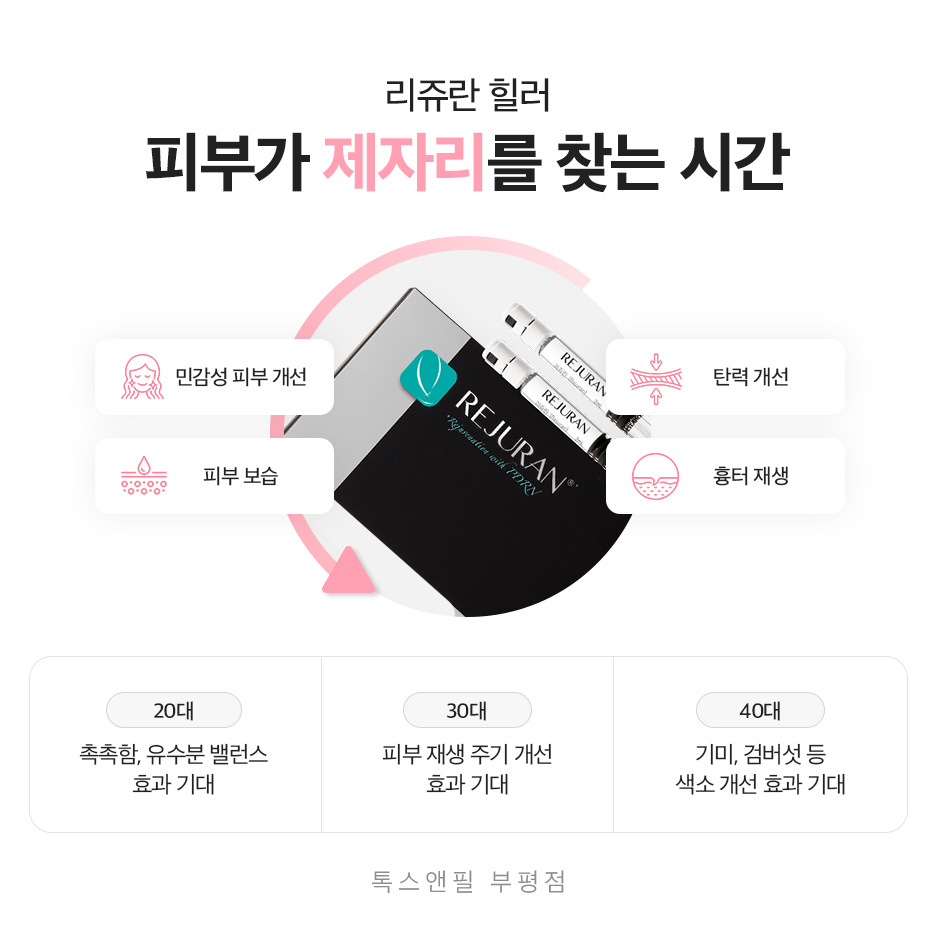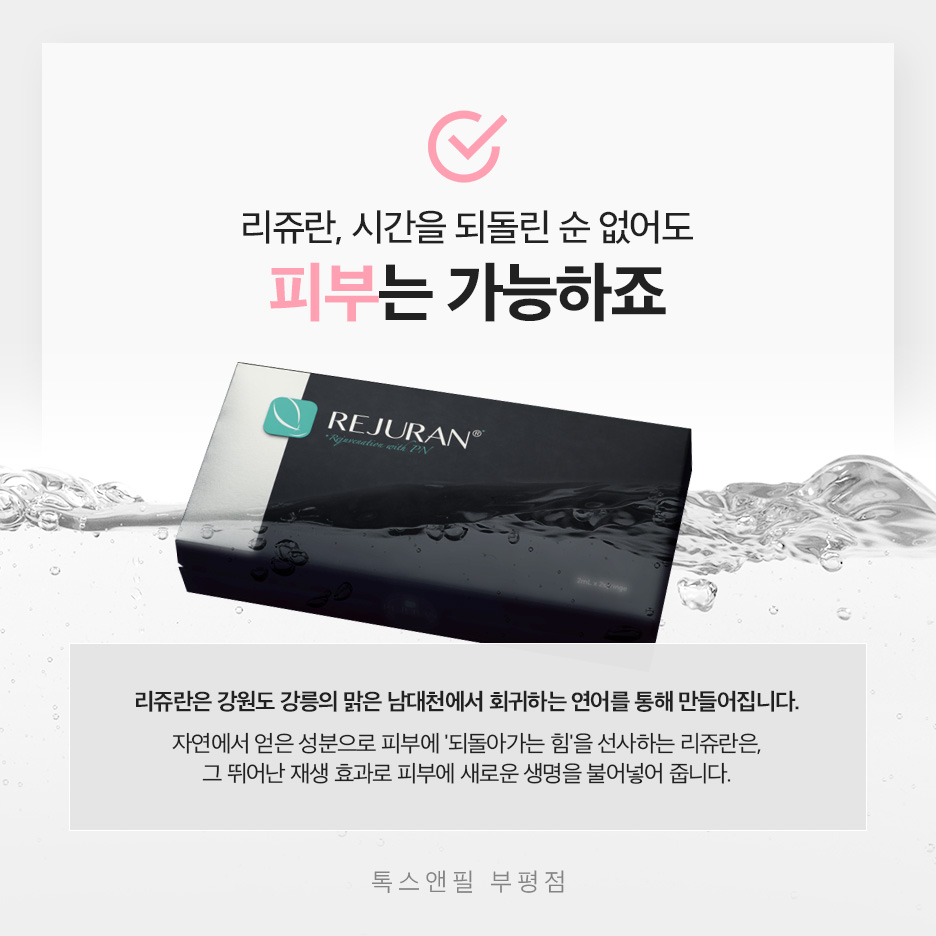 REJURAN HEALER는 앞서 말씀드린 것처럼 진피층에 주입되어 콜라겐의 자가 재생을 촉진하는 스킨 부스터 시술의 하나입니다. 연어에서 추출한 생체 적합물질인 폴리뉴클레오티드(PN, Polynucleotide)가 주요한 성분으로 지목되고 있는데요. 이는 조직을 새롭게 재생하며, 피부의 전반적인 환경을 개선함에 있어 적절한 도움을 줄 수 있는 성분입니다. 이로 인해 건조하고 처진 부위를 다시금 탄력 넘치게 변화시키고, 주름을 완화하는 효과까지 경험하실 수 있습니다.