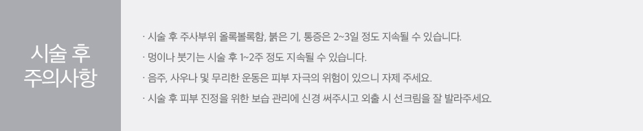 세안이나 메이크업 등은 바로 진행하실 수 있지만, 세안 시에는 저자극 클렌저를 사용해 주셔야 하는데요. 약 일주일 정도 스크럽이나 필링 진행은 삼가야 하며, 외출을 진행하기 전에는 자외선 차단제를 꼼꼼히 발라주시는 게 권장되고 있으니 이러한 사실까지 함께 기억해 주시기 바랍니다.