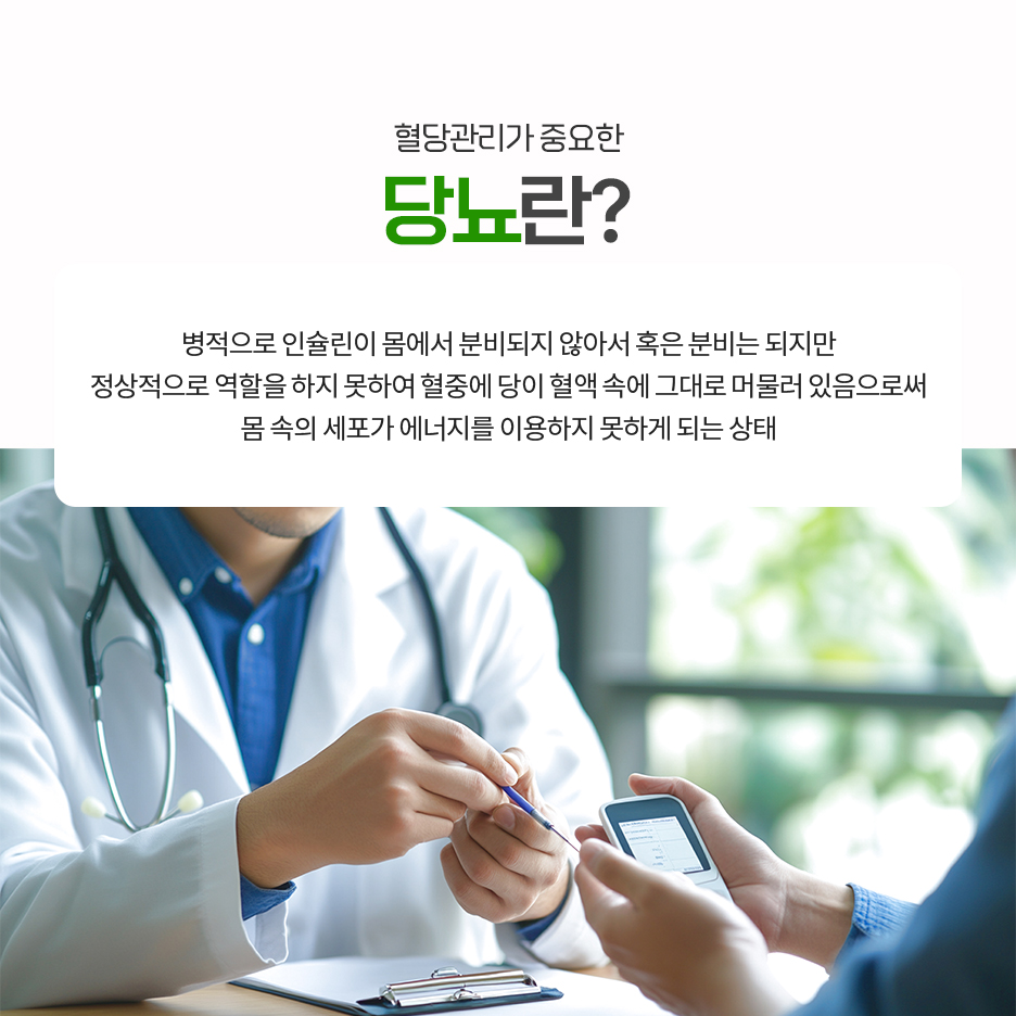 당뇨병은 혈액 내 당 수치가 지속적으로 높아지는 상태를 뜻합니다. 췌장이 분비하는 인슐린이 부족하거나 제 역할을 하지 못할 때 나타납니다. 인슐린은 혈당을 일정하게 유지하는 역할을 담당하는데, 당뇨 환자의 경우 이 조절 기능이 제대로 작동하지 않기 때문에 꾸준한 관리가 필요합니다.