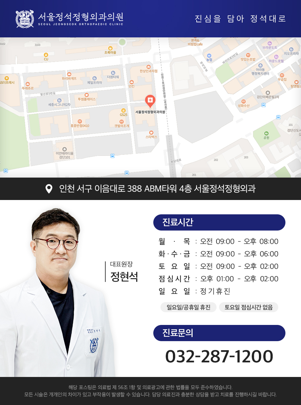 인천 서구 정형외과에서는 재발 방지를 위한 운동과 습관 등 생활 관리법 또한 1:1 맞춤으로 안내하여 일상에서 쉽게 실천할 수 있도록 돕고 있습니다. 목디스크는 재발하기 쉬운 질환이므로 지속적인 관리가 필요합니다.