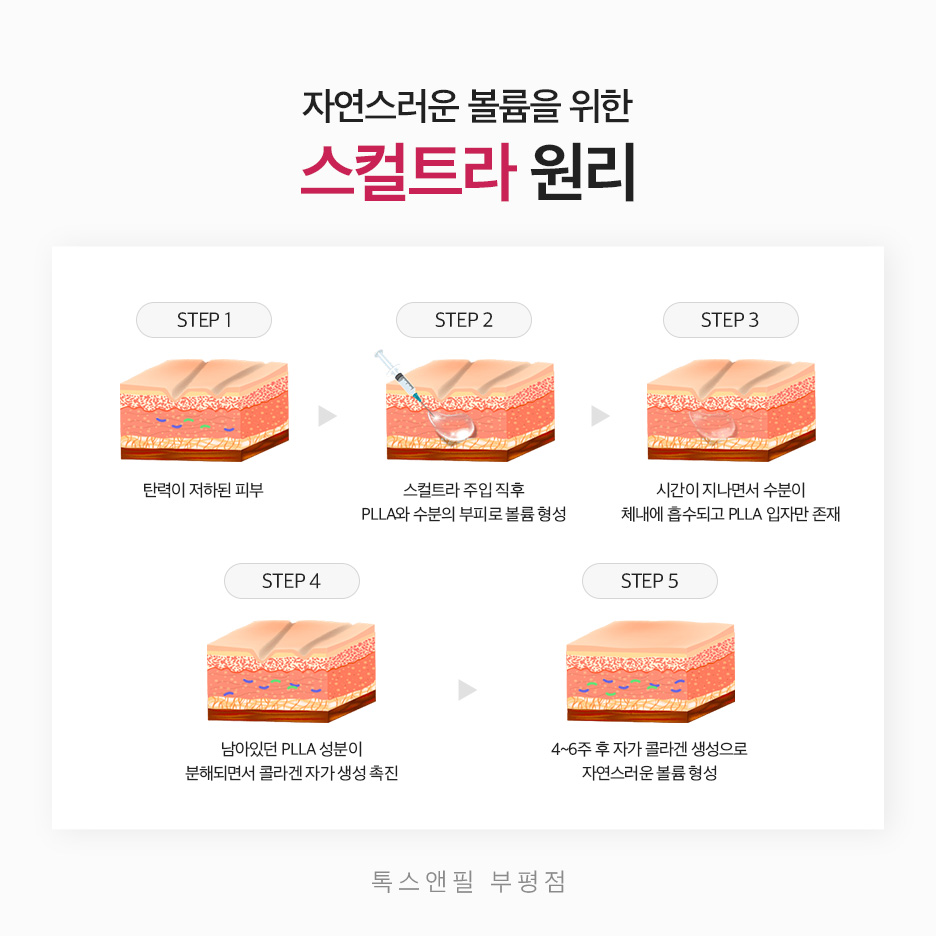 SCULPTRA 진행 시에는 주성분 'PLLA(Poly-L-Lactic Acid)'을 활용하게 됩니다. 이는 식물에서 얻을 수 있는 AHA 계열로, 콜라젠 생성을 촉진하고 난 다음에는 수분, 이산화탄소, 당 등으로 분해돼 사라지기 때문에 인체에 남지 않는다는 특징이 확인됩니다.
